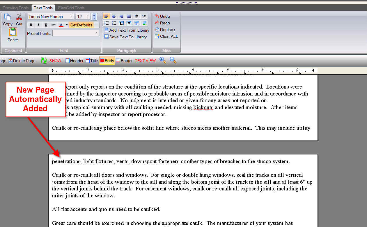 As you know, previously you had to manually create a new page for each Text Page if you needed more than one page. If you needed to add text, the text did not carry over to the next page. Now Text Only & Freestyle pages will automatically add pages as needed and the text will flow from page to page. If you insert or delete text the text will automatically shift across pages. You will see when a new page is added right in the Text Editor (see Below)