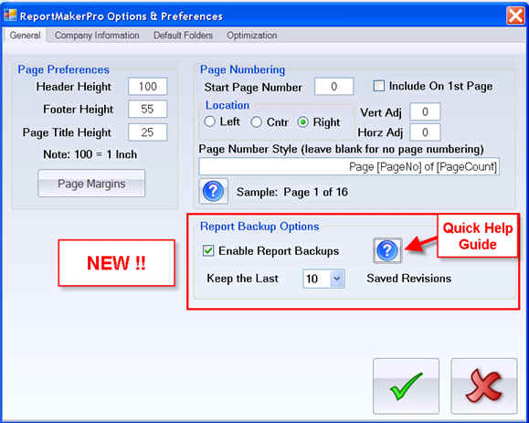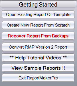 If for any reason a crash occurs we have added new features to recover a recent report . You can recover the very last report that was open or select from a time stamped list of the last 30 saved revisions. No more loosing work because you forgot to save, your key wasn't plugged in, or there's a power glitch or battery dies, or a crash happens. This new feature does a very good job of recovering up to the very last item you were working on! The feature is very easy to use. The recover report feature is available on the Getting Started menu (shown below). Report backup options are set on the general tab of ReportMakerPRO options and preferences dialog screen. You can view detailed instructions by click the quick help button (shown below).