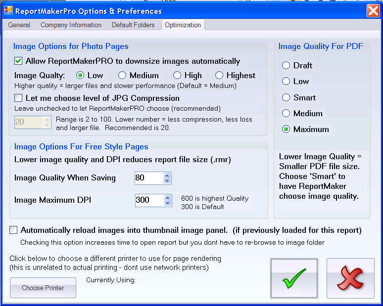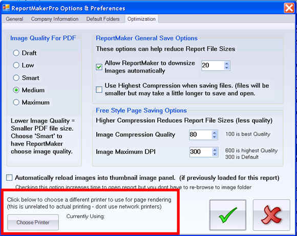 If your default printer is a network printer, it can slow ReportMakerPRO down. ReportMakerPRO uses the 'default' printer driver to draw or 'render' the report pages. We have now added a setting to allow you to choose any printer for ReportMakerPRO to use to render the report pages. This will not effect your printer settings at all, but may increase ReportMakerPRO performance. We suggest always using a 'local' printer or we suggest using the 'Primo PDF' printer if installed. You can experiment with the settings to see if you can improve performance. The setting may not take effect until you restart ReportMakerPRO. The new setting can be found on the Optimization Tab of the ReportMakerPRO Options and Preferences Dialog screen (see below).