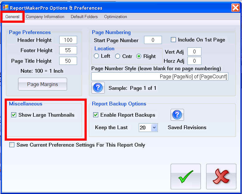 The image viewer now has an option to 'Show Large Thumbails' (see sample below). To select the option, open the ReportMakerPRO Settings dialog screen and check the 'Show Large Thumbnails' checkbox (see below). A little help for those of us with older eyes. You can also HOLD DOWN the right mouse button over a thumbnail to see a large preview screen of the image.