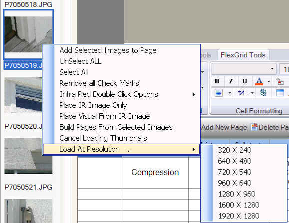 We have also added the feature to load any selected image(s) at several resolutions. This is useful if you want to have the photos default to 'Low' resolution but load a particular image at a higher resolution. Simply select desired image(s) in the thumbnail browser, then right mouse click and choose "Load At Resolution ..." and then click desired resolution (see below). This will load the selected images at the chosen resolution without changing your default resolution settings for loading images.