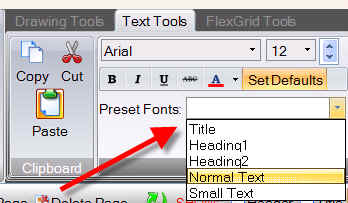 You can select the font and color for Page Titles, Large Headings, Small Headings, Normal Text and Small Text. After you have set these once, you can easily assign the fonts by selecting text and choosing one of the font options from the new 'Preset fonts' dropdown list in the 'Font' section of the text toolbar (shown below). No more scrolling through an endless font list, although it is still there if you need it.